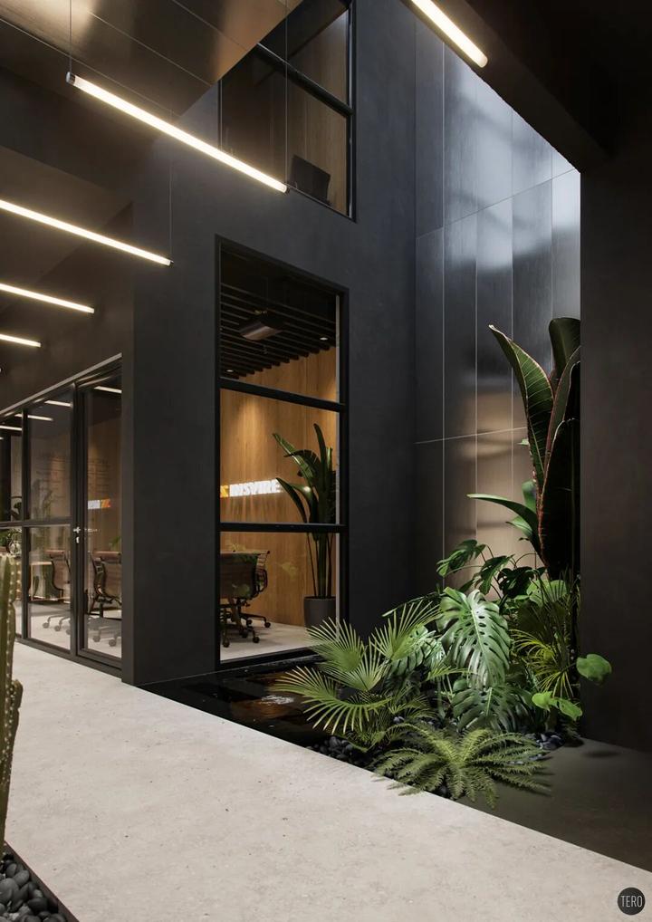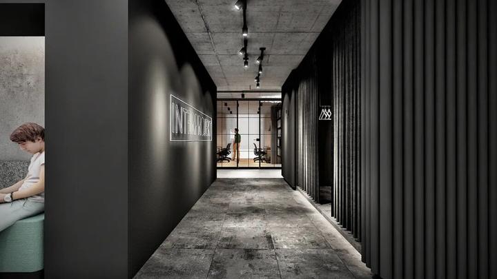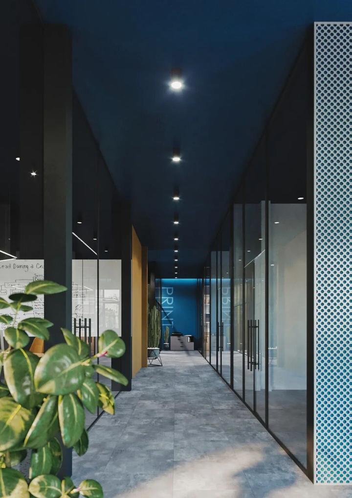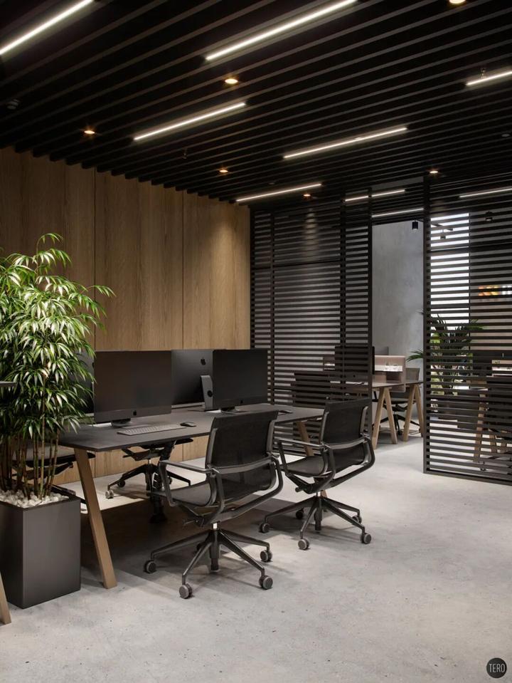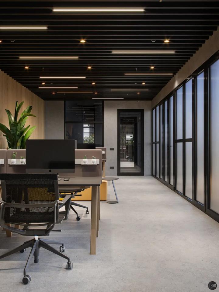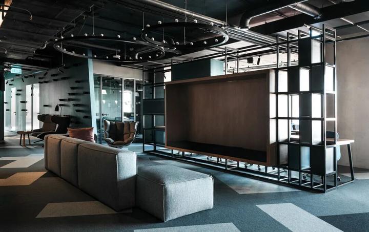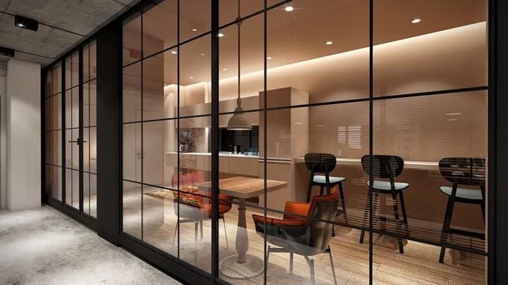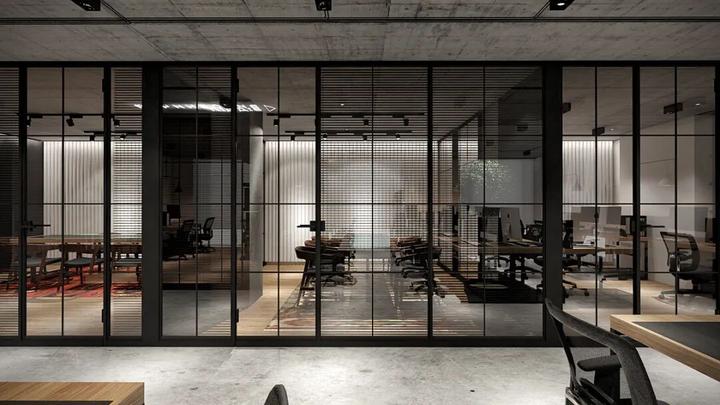 400平方米的公办空间,UMKY Design Studio以现代工业风格,采用玻璃和钢架为主,暗线条和灯轨交替出现,增加丰富的视觉感受层次,同时利用一些红色和木色的装饰,添加到黑色和灰色的环境中,以增强整体生活的温暖。