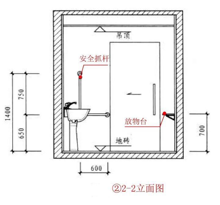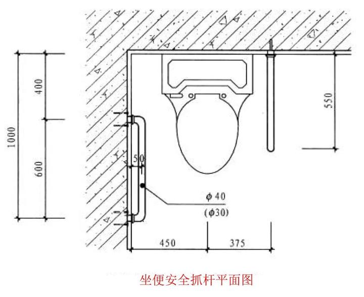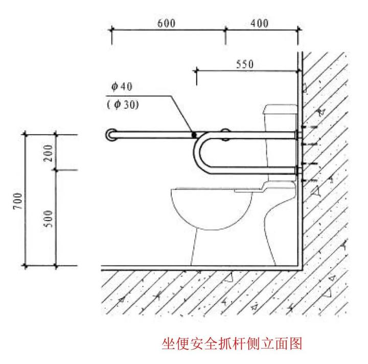 5、安全抓杆的直径应为30-40,内侧应距墙面的距离400(单位:mm)。