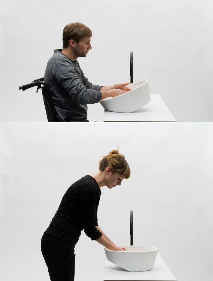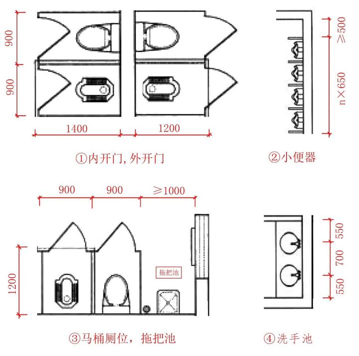 b、洗手池进门的通道≥1800 ,洗手台面宽≥500。正常成年人可以自如通过的距离为600,公共卫生间进门通道至少要允许两人并排进出,所以是1200(单位:mm)。