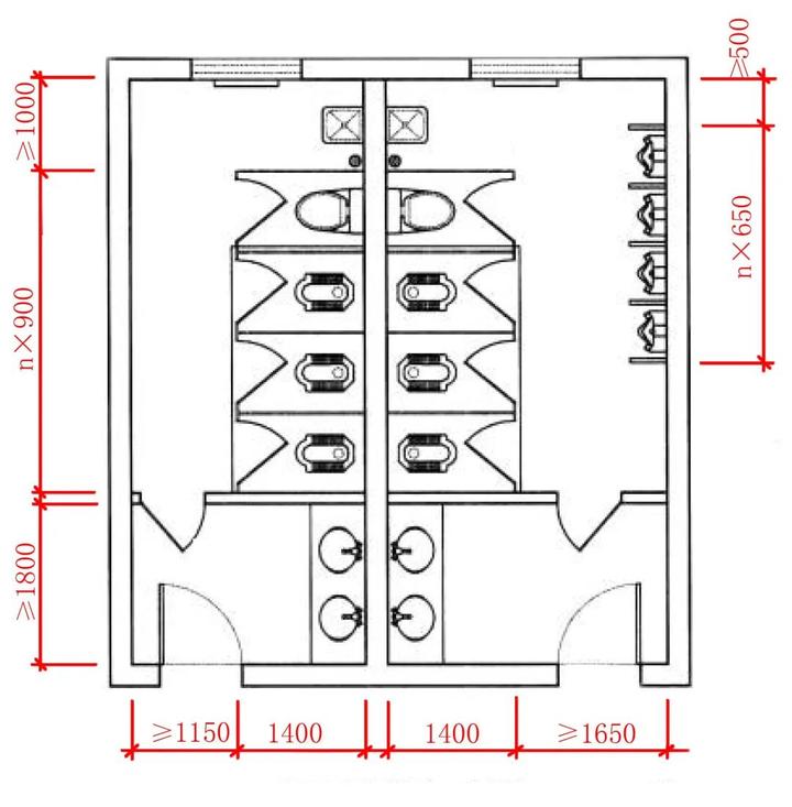 b、小便器并排的中心距离应该≥650,拖把池空间≥1000×1200(单位:mm)。