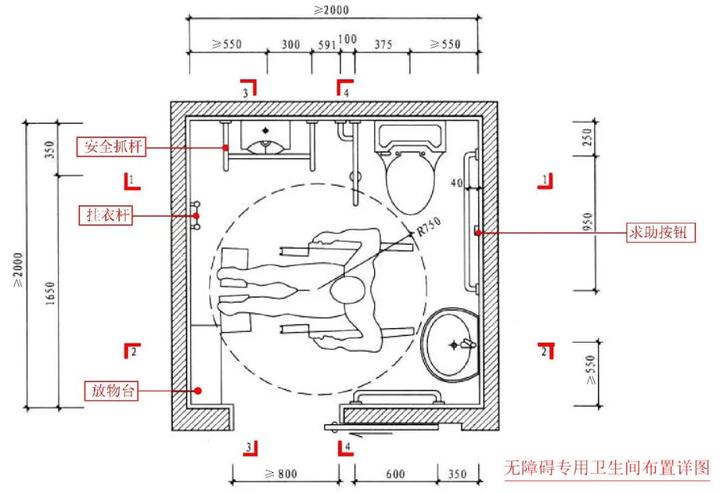 2、考虑到轮椅的活动半径在750,所以卫生间入口门尺寸应该≥800(单位:mm)。