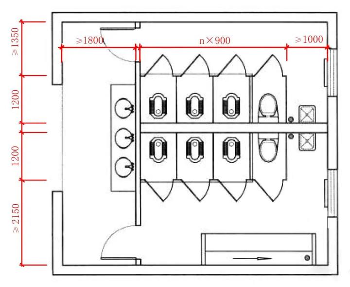 c、隔间外开门的通道距离≥1350,带小便池的通道尺寸≥2150(单位:mm)。