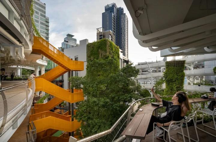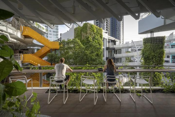 与The Commons相同,The Commons Saladaeng也利用了“阶梯”贯穿整个商业,并设有大量的共享公共空间,利用约30%的建筑面积设计成“Common Ground”,为人们提供良好、舒适的户外环境。