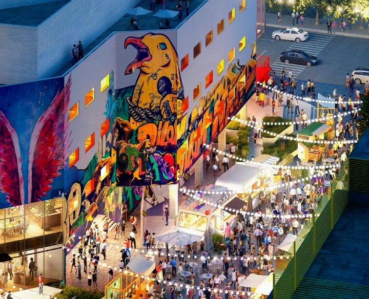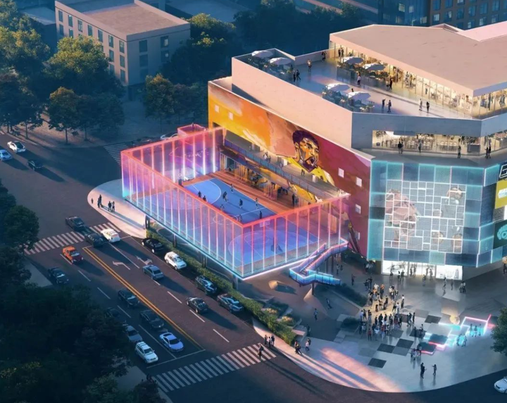 具体包括在主体盒子区一直往东延伸到室外,紧贴着建筑的外轮廓,新建了一个NBA光影空中篮球场与滑板区,并引入 “公路商店”,形成 “街头潮玩” 空间,以运动带动社交。充分利用外侧支路,打造MARKETPLACE限时步行街与潮流市集区。通过涂鸦市集和街头画廊的打造,为年轻人提供了一个展示自我和接触新潮流思想的平台。