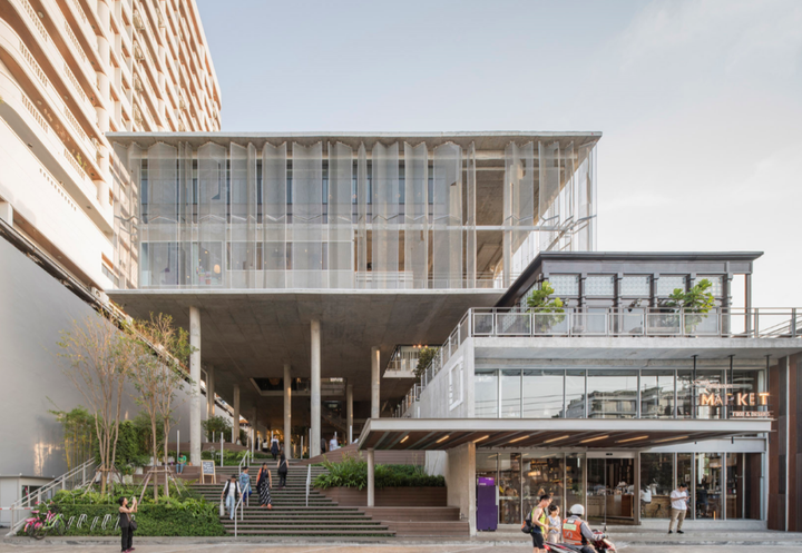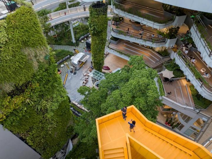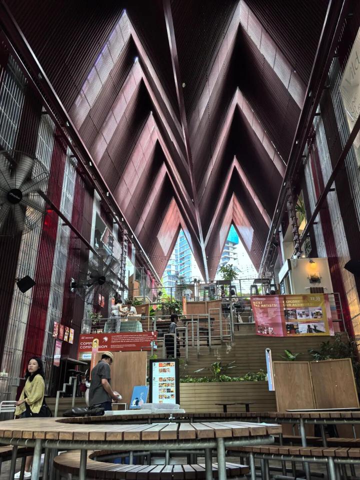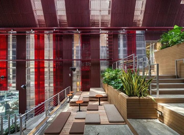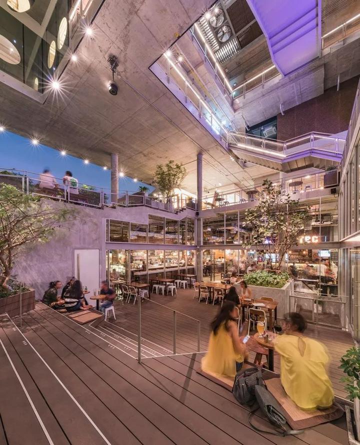独特的原生建筑the Commons 采用了通透的、水泥裸露的原生建筑,与周边环境融合,展现城市可持续发展理念。高度挑空的内部空间视觉更开阔、通透,解决热带潮湿闷热环境下的通风问题。