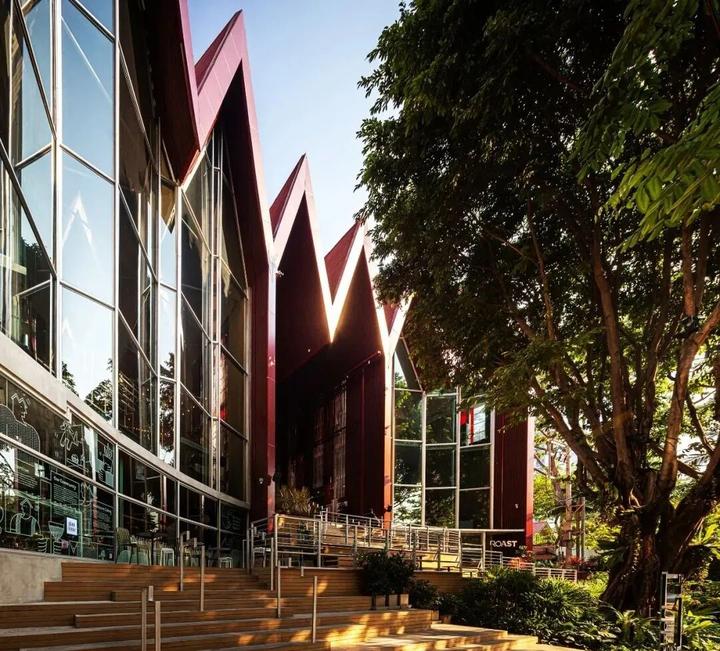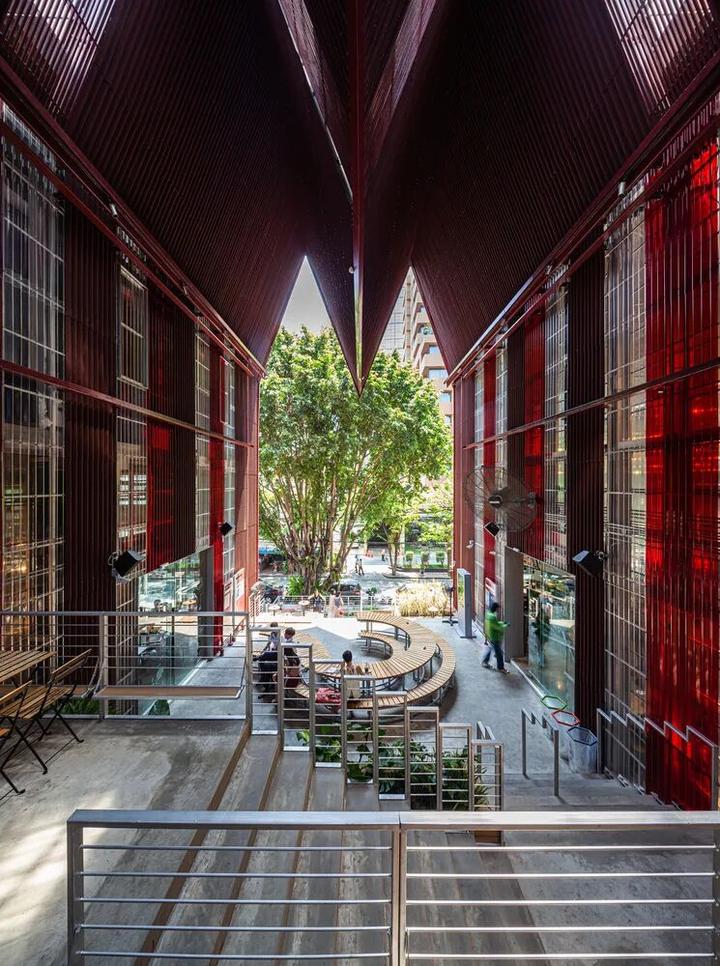 The Commons Saladaeng外观最引人注目的是整片的红色屋顶,灵感来源于19世纪末,该地区火车站台亭子红色的屋顶,既延续了泰国第一条铁路上的标志性建筑,也是在向历史致敬。此外,The Commons Saladaeng还保留了原址上15米高的大榕树,也留下了当地人们记忆中逝去的时光。