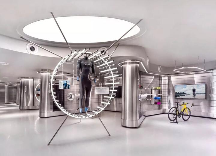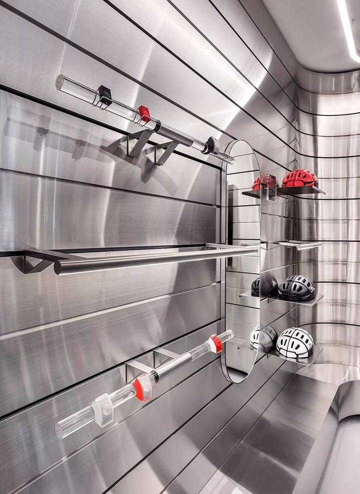 这是一间由不锈钢管构成的沉浸式运动品商店,灯带与一排排钢管构成动感的外立面,表现出一种动态活跃感。另一个设计亮点是与置物架、展示架整合在一起的LED灯带,构成了实用又极具未来感的照明系统。