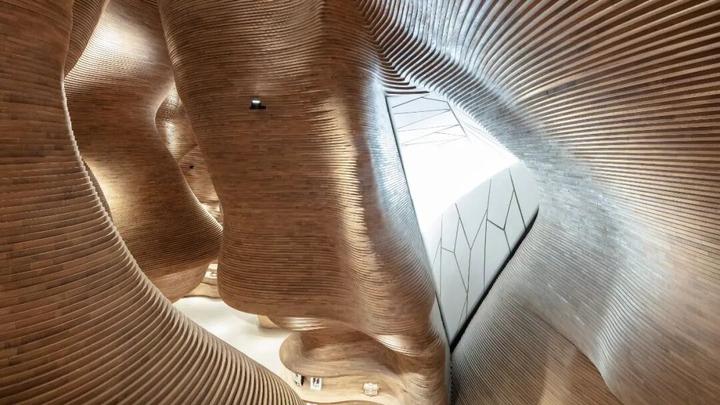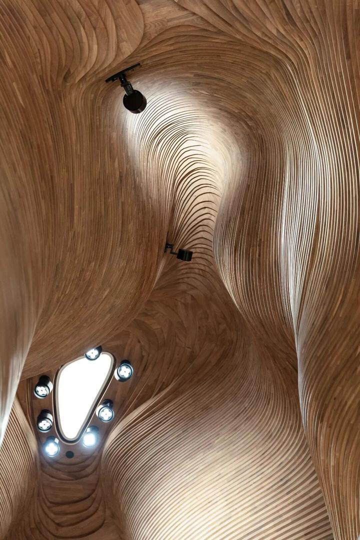 这个有着绵延起伏墙壁的木结构建筑是卡塔尔国家博物馆(National Museum of Qatar)内的礼品店。由澳大利亚事务所 Koichi Takada Architects 设计,其灵感源于卡塔尔著名的 40 米深的洞穴景观。