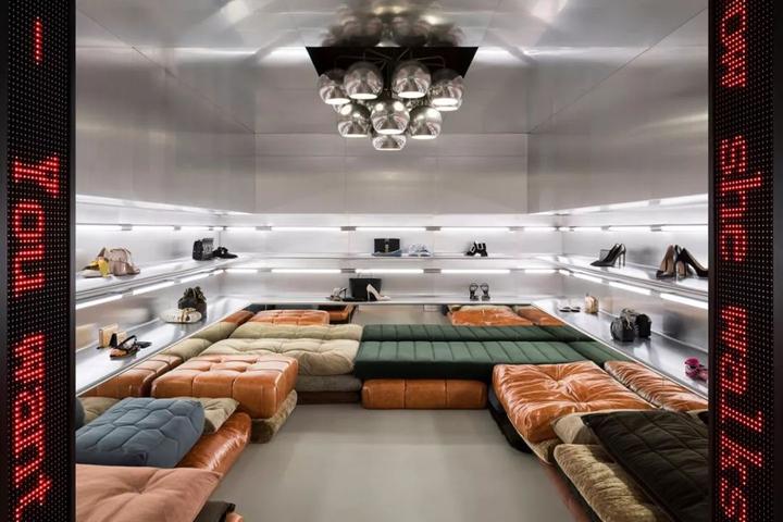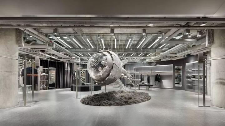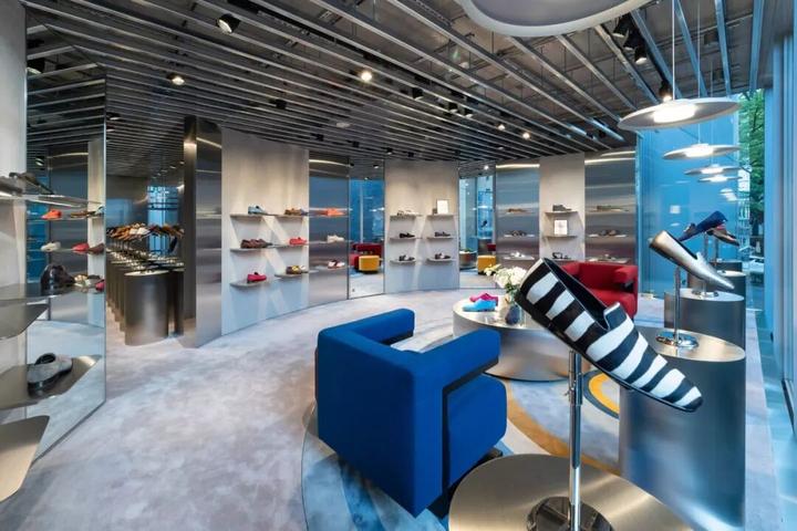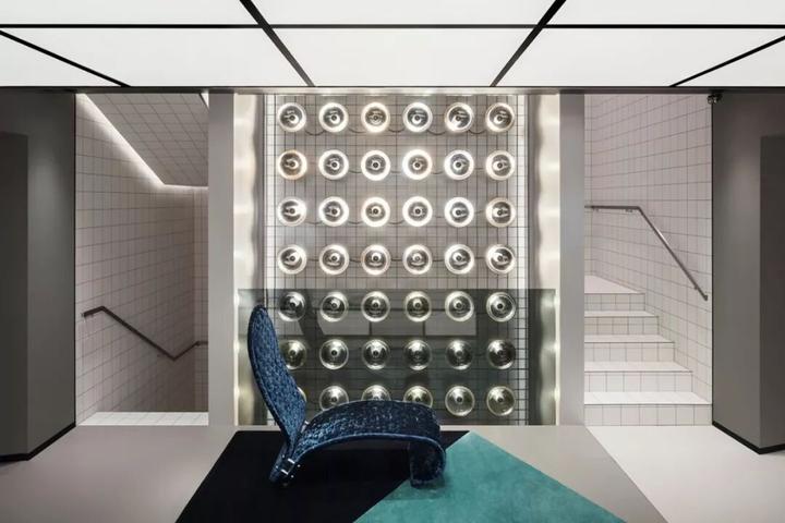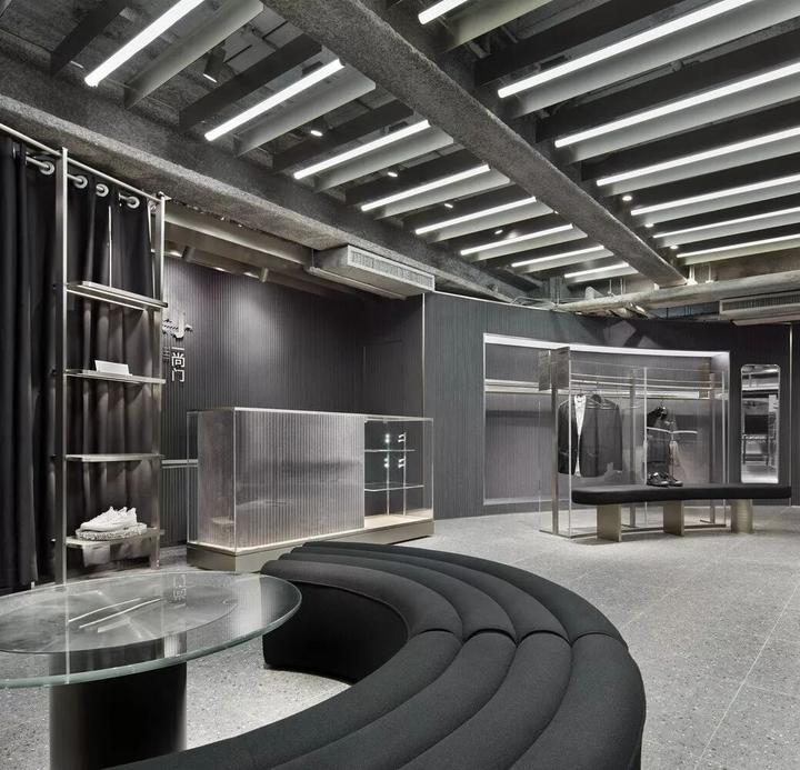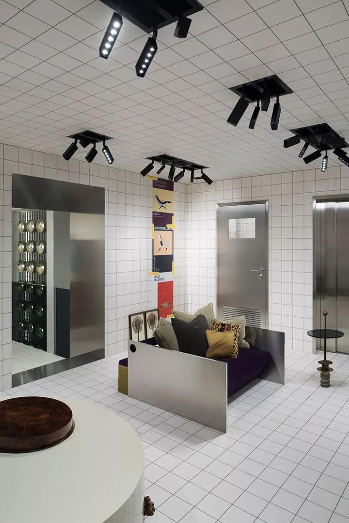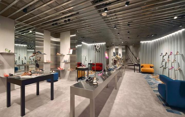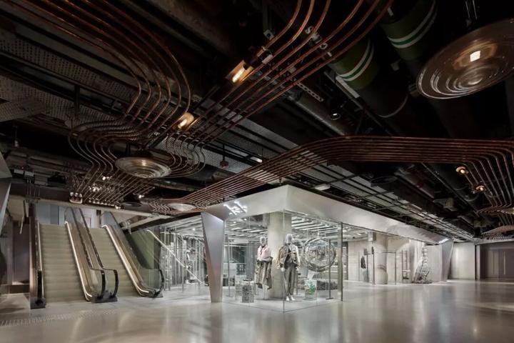 内部大量使用圆柱形混凝土隔墙、抛光不锈钢饰面和镜面元素,一根根钢条构成间隙很宽的格栅天花,构成统一的灰色调背景。而各种撞色沙发、地毯与彩色的商品形成呼应。