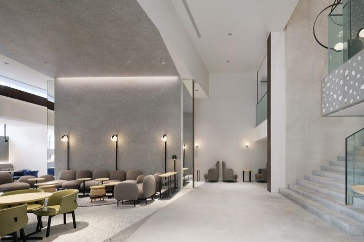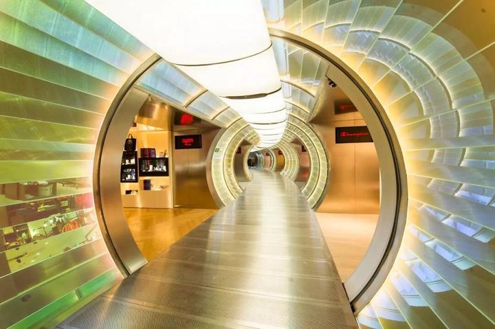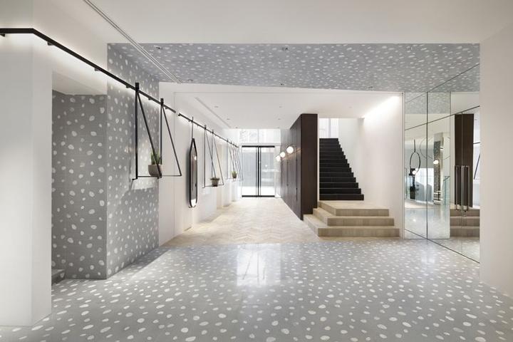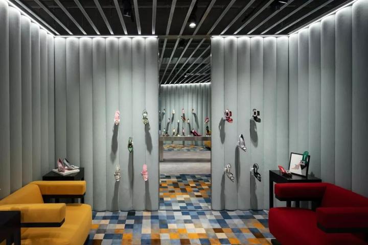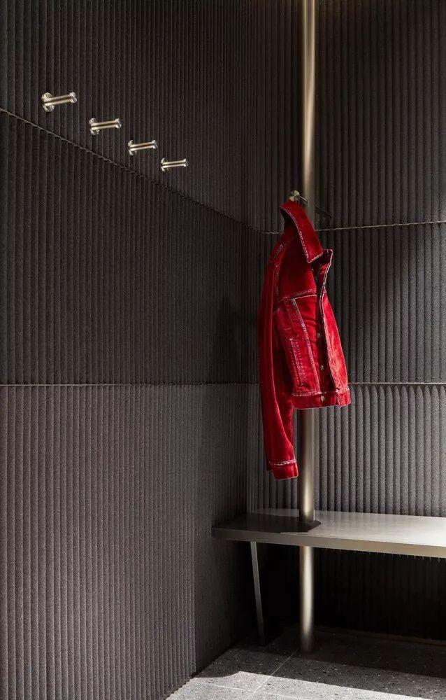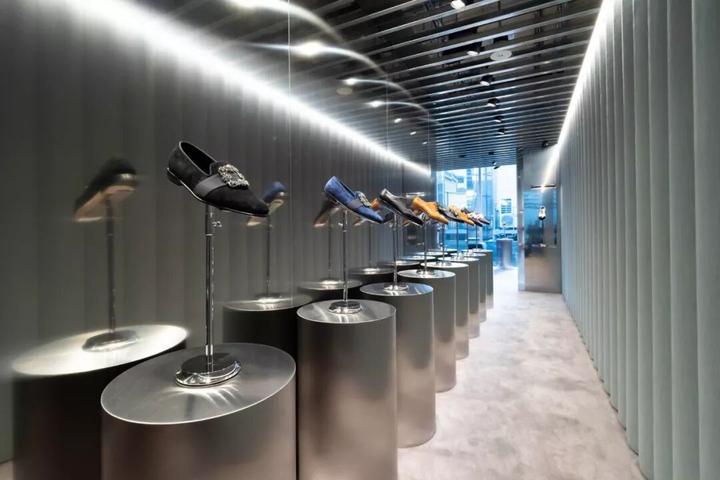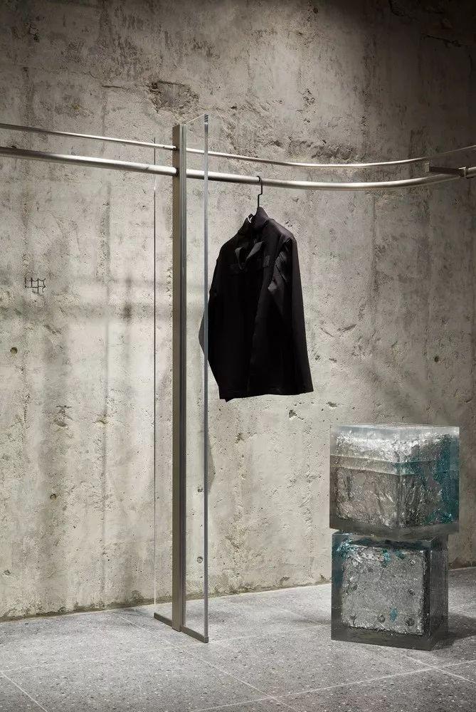 内部大量使用圆柱形混凝土隔墙、抛光不锈钢饰面和镜面元素,一根根钢条构成间隙很宽的格栅天花,构成统一的灰色调背景。而各种撞色沙发、地毯与彩色的商品形成呼应。
