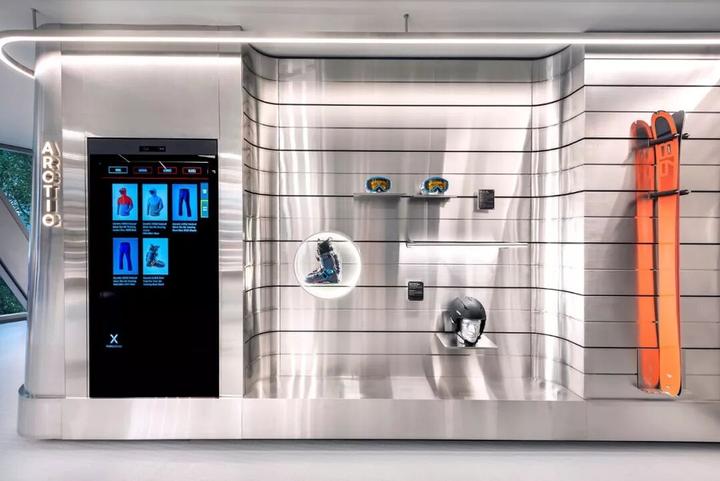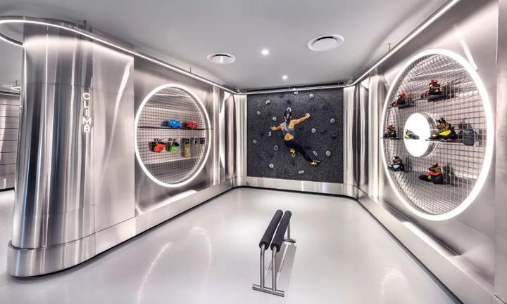 设计师还在店内布置各种沉浸式装置,例如攀岩体验墙、360°全景滑雪体验器等,形成了店内一大互动特色。