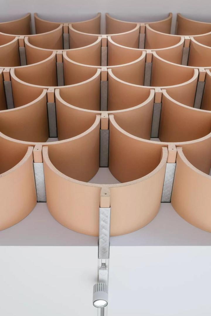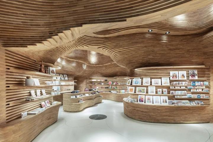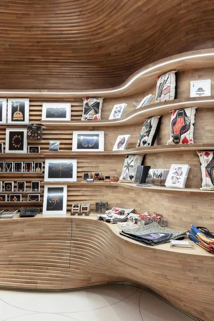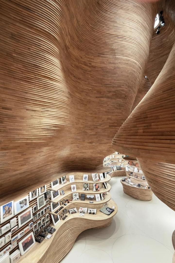 礼品店内部高耸的木墙是使用 3D 建模设计的,总计40,000块木材由意大利木匠克劳迪奥·德沃托(Claudio Devoto)在多哈手工组装的。被用于构建出恢弘深邃的内部空间,代表着卡塔尔的历史和文化。
