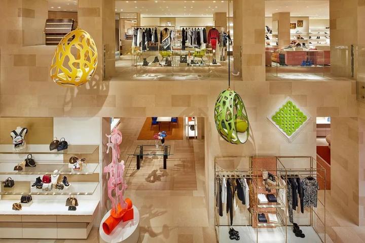 同样是Peter Marino 的作品,LV在伦敦的这家新店外观着实吸睛——放射状的外墙装置代表着品牌经典元素,撞色手法的运用彰显着百年品牌新的活力,真的是「好炫彩、好夺目!」。