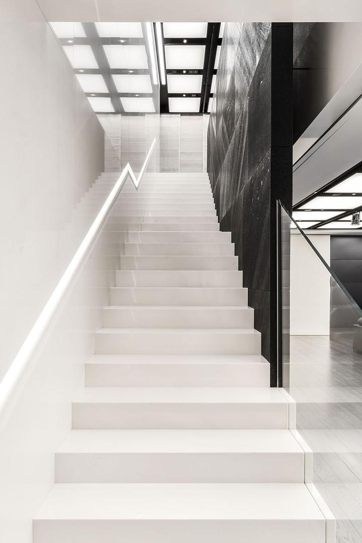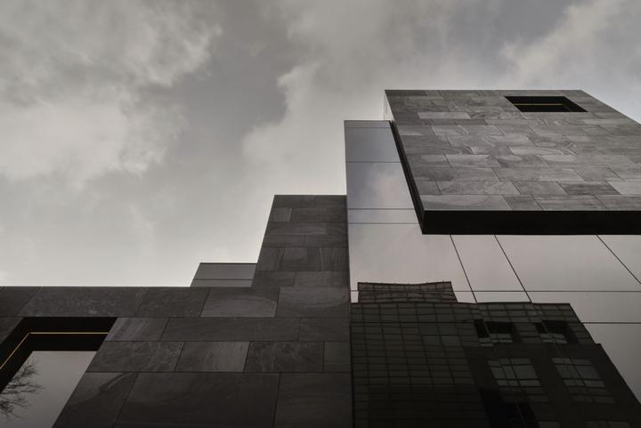 采用全黑色石材与玻璃幕墙组成整体结构,只在建筑一角标有白色LOGO,形成强烈对比。