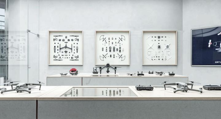 整个旗舰店的风格以简约风格为主,空间明亮通透,低调亲切 ,在产品展台后方,有一排能让极客们看到就会很兴奋的「爆炸图」。也是大疆店内首次使用无人拆解图作为墙面装饰。