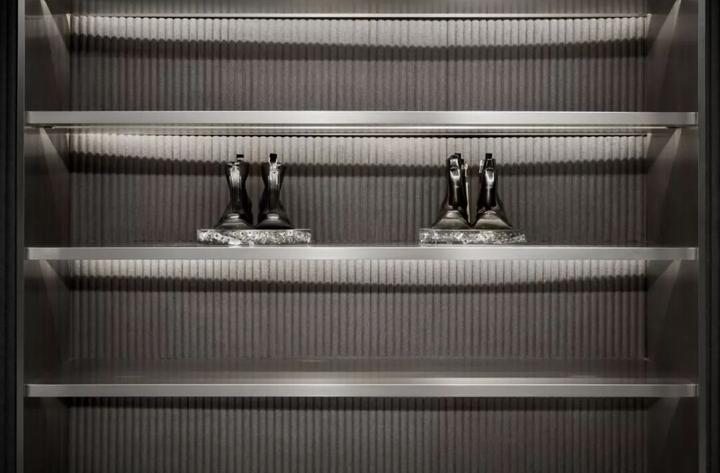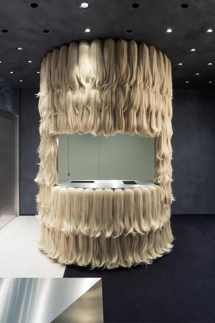 限量版家具、艺术品和个性的银色镶板组成了前卫的内饰风格,同时,他们为店铺引入了模块化的概念,方便楼层陈列进行定期更换。比如这个从上到下都用假发装饰的收款台是由钉板构成的框架,随时可以把假发拿掉换成别的更酷的装饰品。