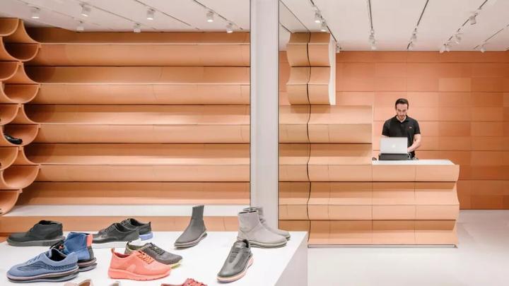 Kengo Kuma为鞋类品牌 Camper 设计的这间店面使用了弧形红色瓷砖,在墙壁上组成优美的扇形图案。这样的墙面设计既可以用作鞋子的展架,又为狭小空间营造出纵深感。