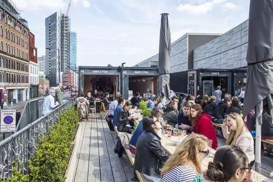 全球首家临时性集装箱购物中心BOXPARK位于英国伦敦肖尔迪奇区,由60个集装箱历时一年搭建而成,开创了以短期、可移动建筑进行商业更新的新模式。项目明确在运营五年后(2016年)予以拆除,体现了“临时使用、生态复原”的更新理念。
