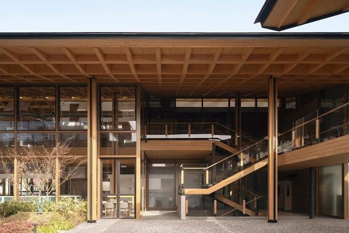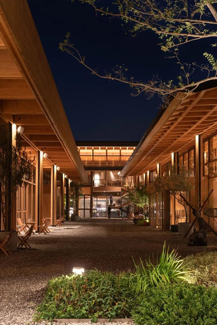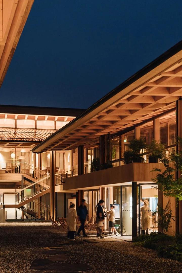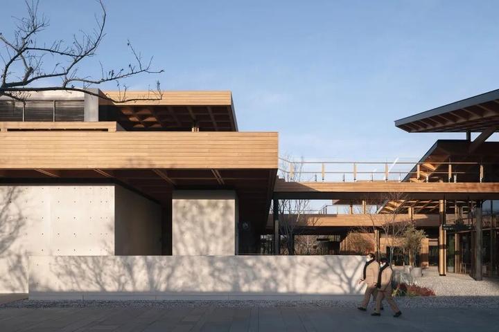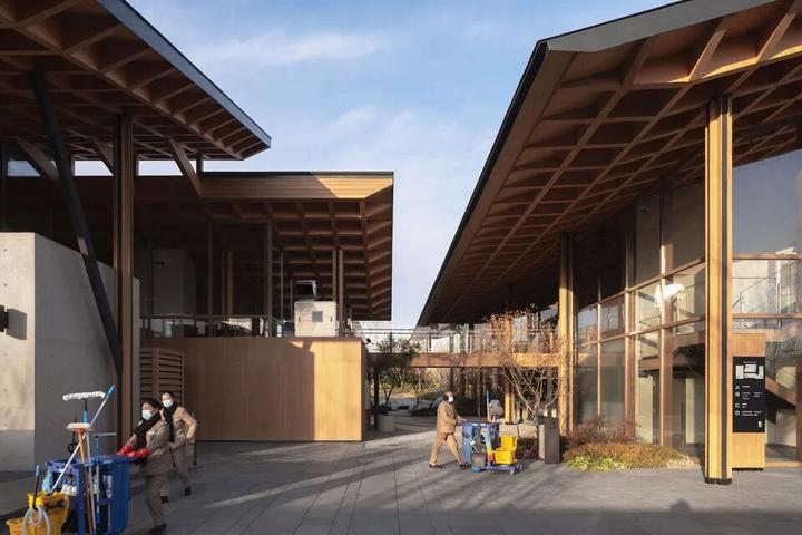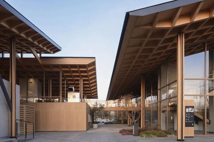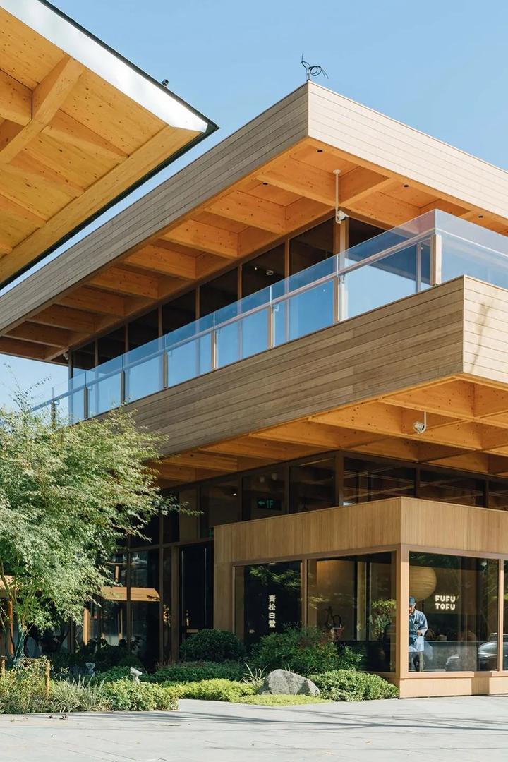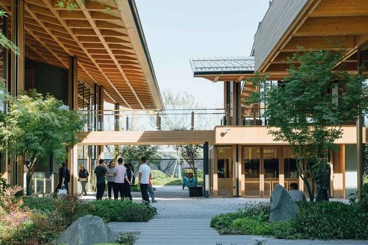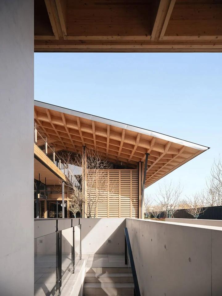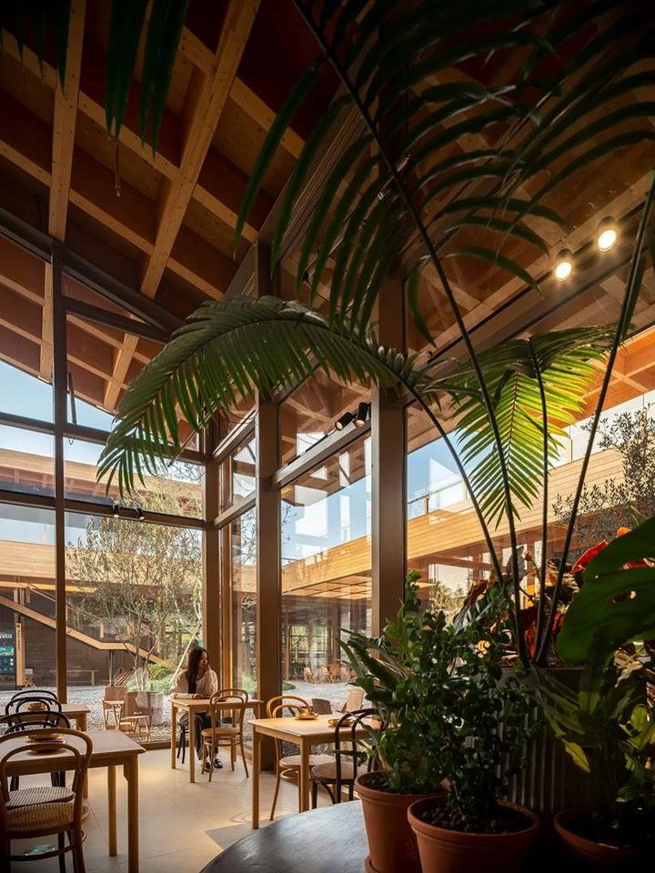 在用地局限、动线交织的基础环境里,绿植难以成林成片,退让与借景成为最重要的设计手法,留出商铺展示画面与舒适活动区域,烘托展现建筑木构之美,在观赏点以花艺手法布置植物,让室内外边界逐步消融。