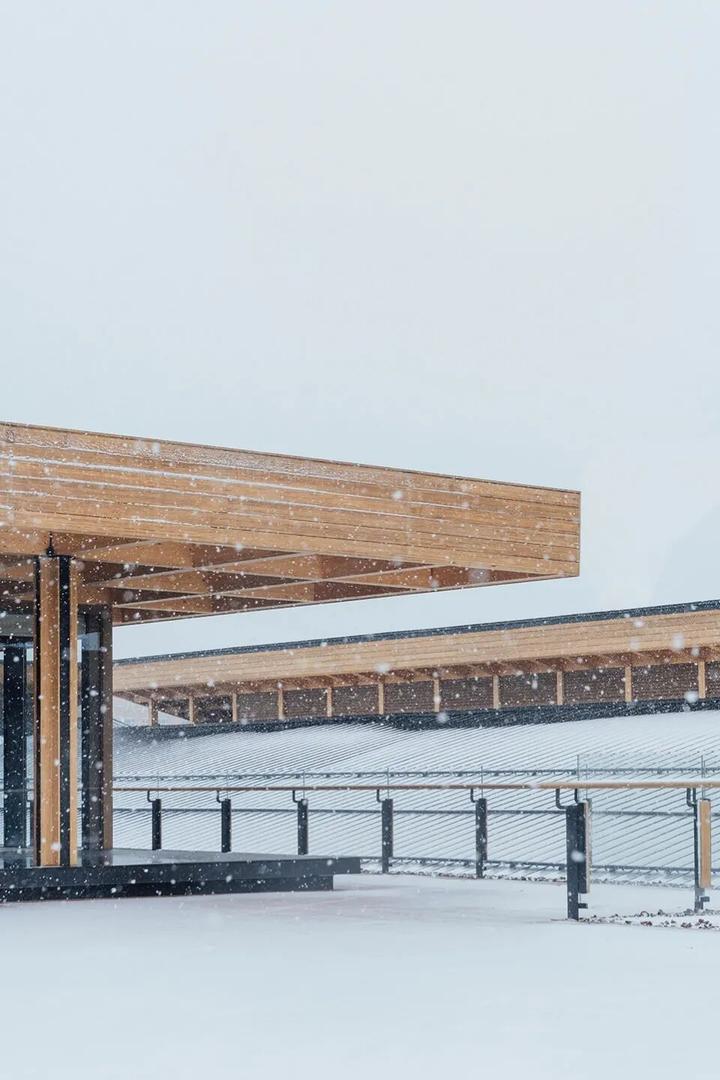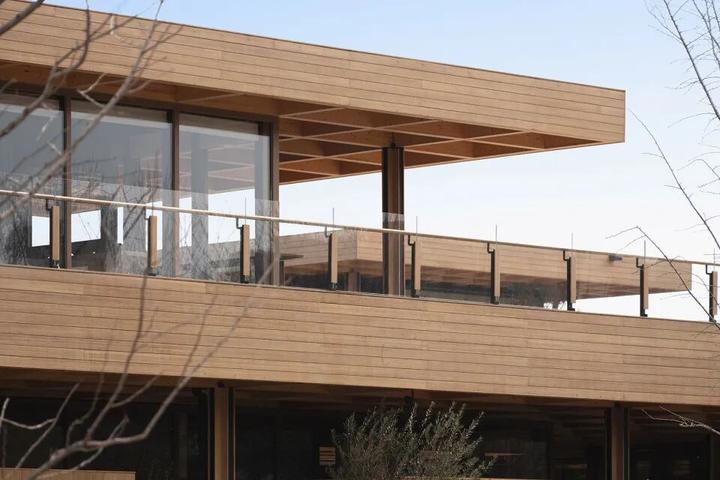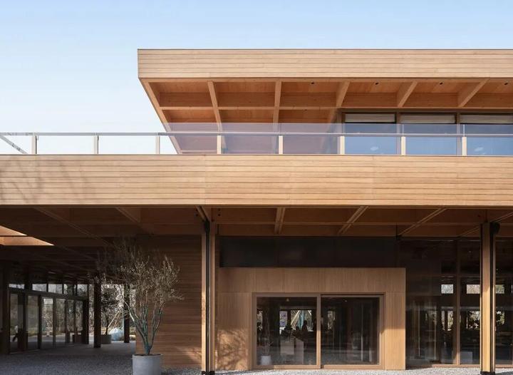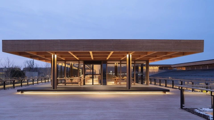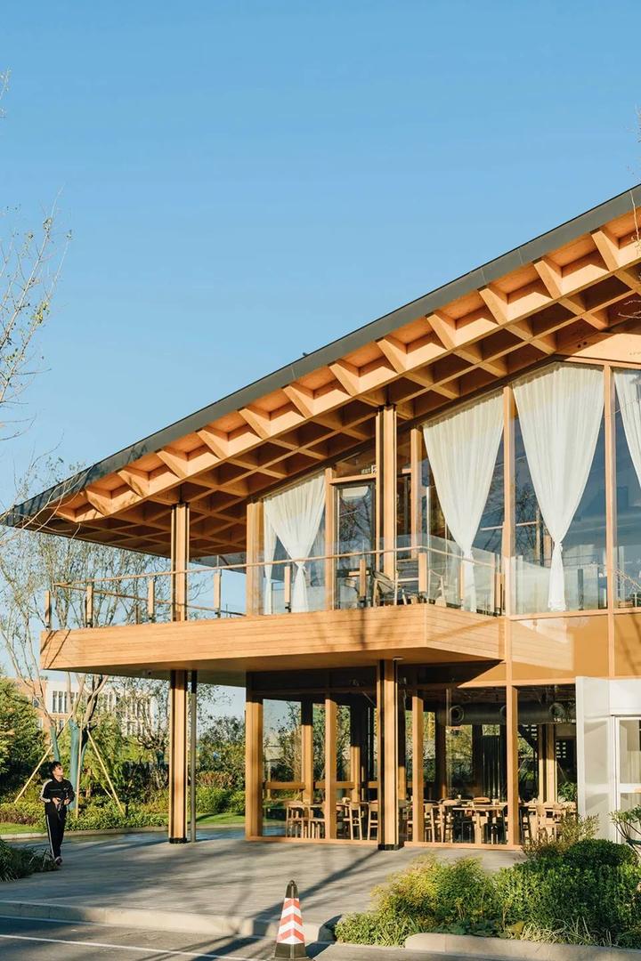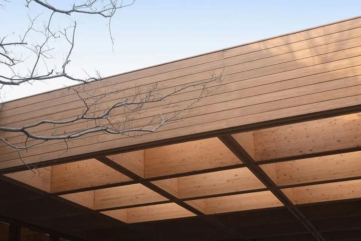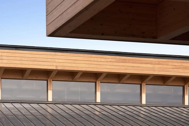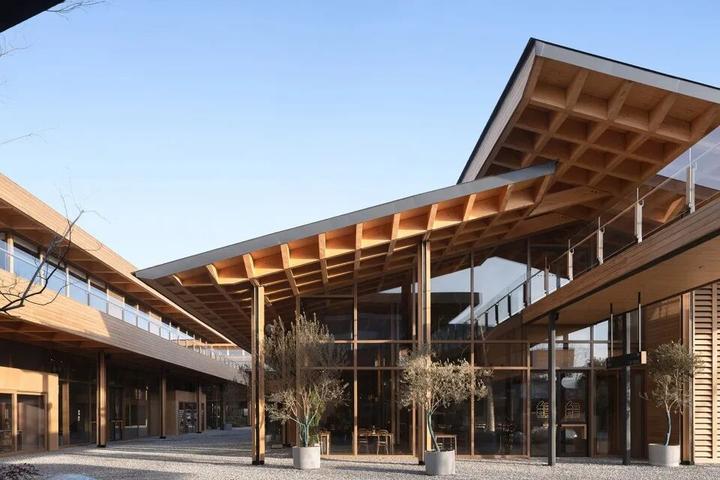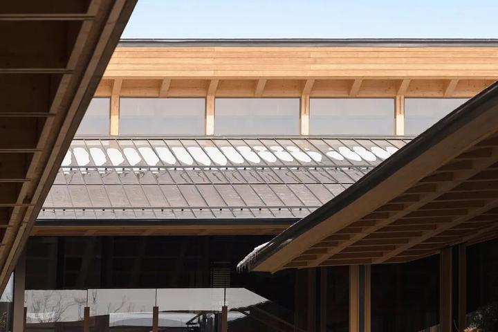 云杉实木与钢结构相接,具有轻便的结构特性,为构建多元的空间提供了无限可能。室内屋面的檩条和椽条位于同一平面内,木质框架结构不做修饰,尽情裸露在外,营造休闲商业气息的同时,秩序分明的搭接将结构美体现得淋漓尽致。