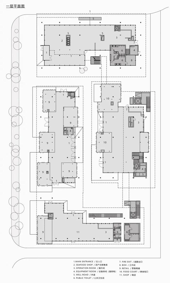 市集社区提供最丰富的蔬菜瓜果、水产生鲜的采买便利,也力图最大程度地在空间中重现记忆中的热闹与人情味。空间还可容纳多样性的经营需求咖啡、小吃、酒吧、餐饮、日用零售等,满足居民日常亲朋聚会、外出就餐、商务洽谈等等多样化的需求。