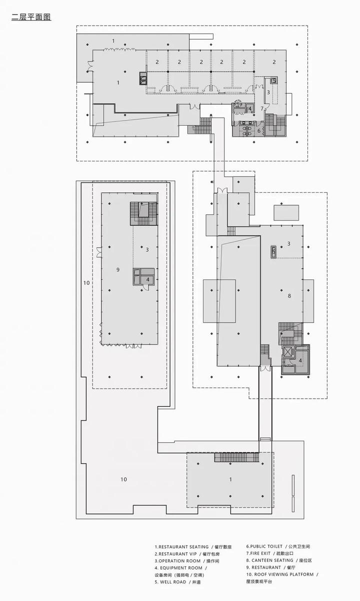 分割体块的轴线,成为连接住区和公园两侧人流的主要行动流线,也成为串联各功能区块的重要交通路径。外部临街部分,结合建筑的灰空间进行外摆布置,内外街结合设计,打造充满活力的商业氛围和消费场景。