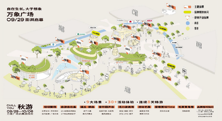 在万象广场亮相之际,成都万象城打造了「秋游 CHILL YOU」广场游园会,带来9大场景、20+好物展位、30+活动体验、连续8天的梦幻畅游,每个空间承载不同内容,启幕首日吸引客流超19万人次。