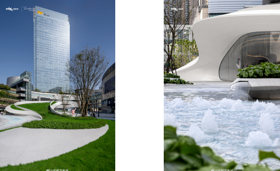 “漫丘”为广场的视觉焦点,草坪营造出自由休闲的氛围;水游花园可观赏可休憩,疗愈又放松;2800㎡的中央下沉阶梯式广场剧场氛围拉满,可供休闲社交,亦可成为各式活动的举办场所。