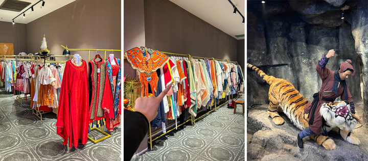 宋朝食间的另一大亮点是汉服体验馆(需付费)。除了提供宋朝传统的男子常服襕衫、女子襦裙款式,也有不少经过改良的“新中式”款式。换上古装后,可以到多个拍照点位打卡,如武松打虎、鲁提辖倒拔垂柳等经典场景,还可以到大舞台,看各式文艺表演。