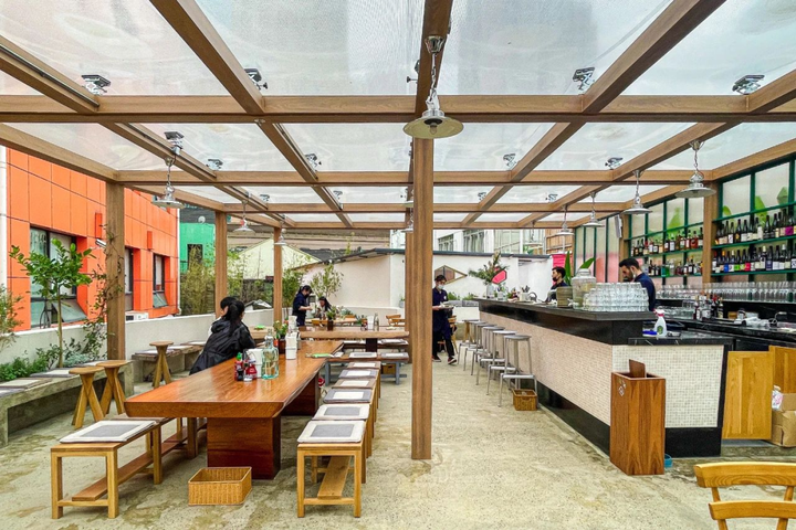 现所二期,前身也是利用上海萃众毛巾厂改造的一家青年旅社,此次改造后建筑整体延续了一期白色的主色调,但保留了老厂房里的绿色涂鸦墙,这些涂鸦最早可以追溯到2000年初,上面有来自不同国家的旅客留下的不同文字,强烈的街头风与浓浓的故事感扑面而来,与空间内的品牌内容形成一种冲突的美感。在业态上,二期则以餐厅,快闪店、以及创意集合店的展售为主。