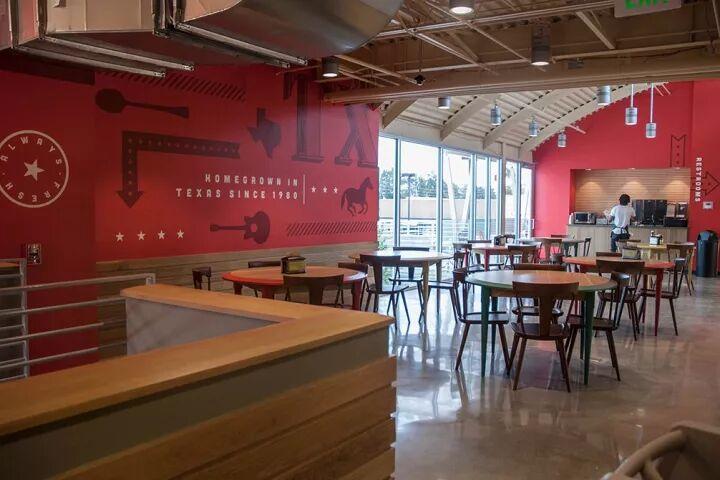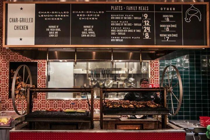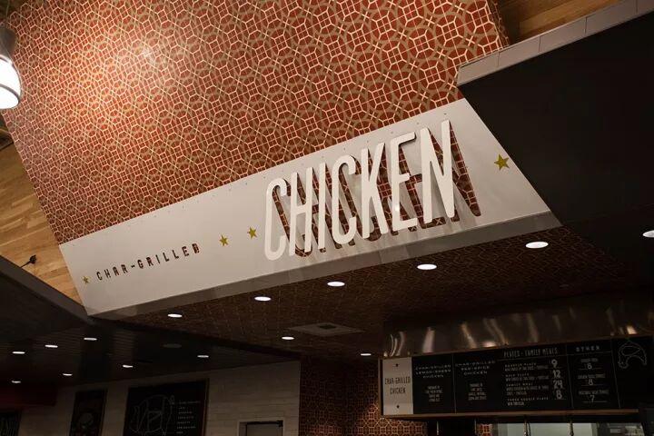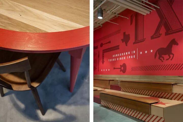 为了提升店内热闹的氛围和室内建筑特色,设计师使用浮雕效果的logo与增添纹理深度的分层材料,突破单纯的平面呈现层叠的效果。通过室内使用大量轻松的插图,流行的色彩,以及诙谐的语言来向人们展示了市场生机勃勃的活力与该地区作为牛仔的根源文化。