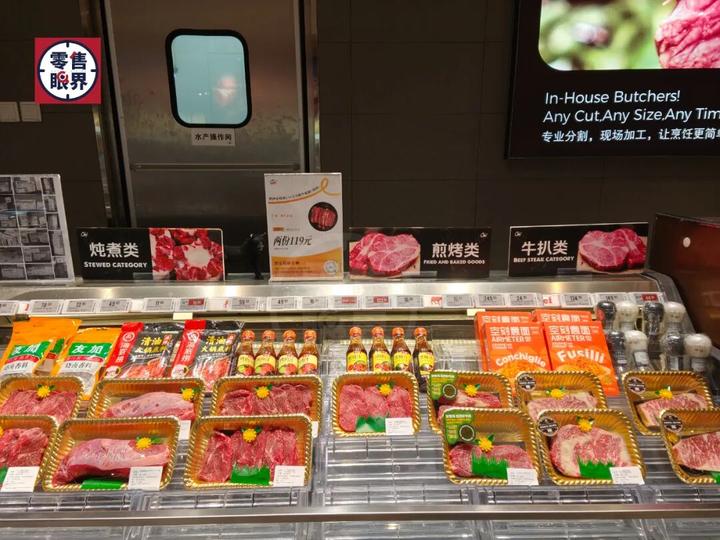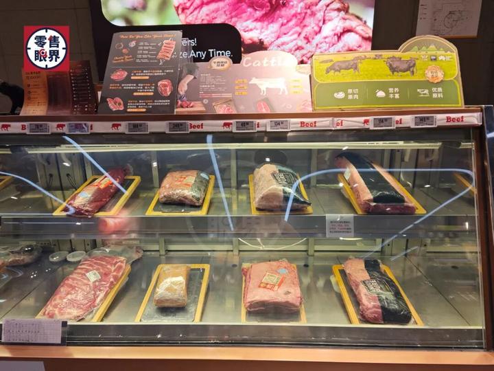 这家店在肉品与水产区的呈现上颇具巧思,尤其对牛肉的陈列方式令人耳目一新 —— 按不同烹饪需求细致划分出牛扒类、煎烤类、炖煮类等区域。这种精准分类不仅让消费者能快速找到适配食材,更有效缩短了决策时间,提升了选购效率。