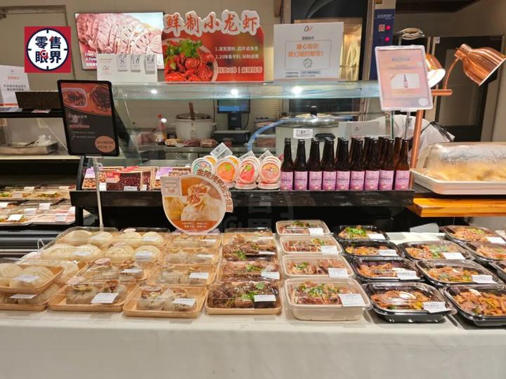 在熟食区则是以份包装的即食美食居多,有酱卤系列、轻食沙拉、寿司鱼生、南京特色的金陵大肉包、鸭制美食,还有“夏日限定”的鲜制小龙虾、港式烧腊、现制的隆江猪脚饭等。此外,熟食区关联陈列了自营精酿啤酒,零添加的广式糖水。