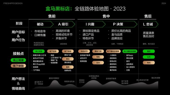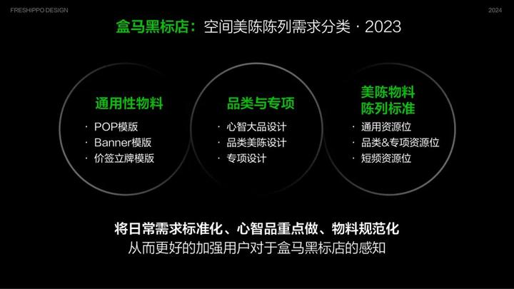 盒马黑标店从10月开业,在品牌-营销-空间美陈设计上环环相扣,盒马设计团队的同学投入很多辛勤的日夜,在这个项目的过程中也进行了一些经验沉淀和方法总结,主要有以下三点: