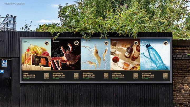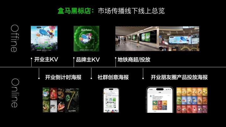 线上部分介绍的是开业倒计时和朋友圈广告的投放,精选盒马Premier限定产品,结合品牌调性做产品的海报设计。