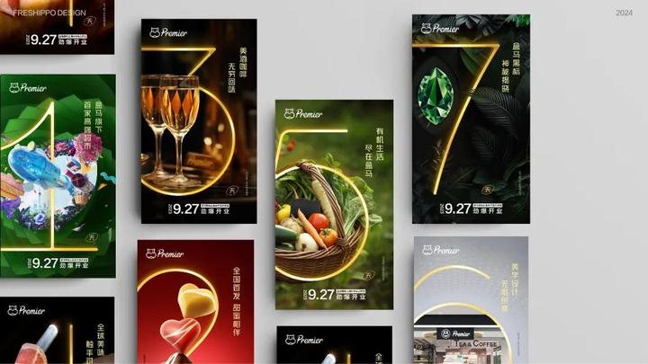 标识中Premier的i的叶子形状,自然成为了盒马Premier业态的独有符号特征。在符号的运用设计中,采取了开放式不设限的方向,可单独使用,可错落使用,也可无序或有序阵列使用,可以充分玩转平面构成。