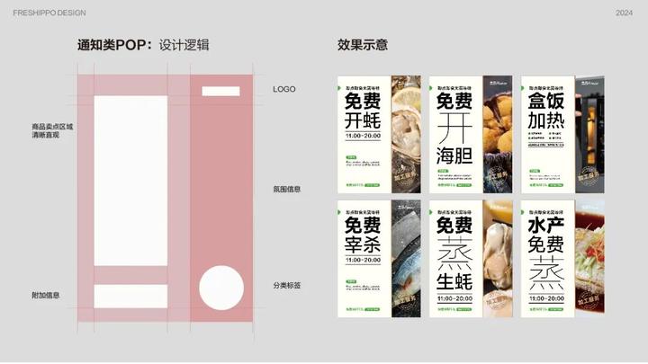 在具体实施中,我们将POP模板区分为商品与服务两大类。考虑到POP物料更换的高频率,我们采用场景氛围图来增强食品的吸引力和整体的高端感,用色彩和版式来区分不同的信息类别。