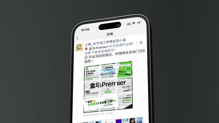 在国庆开业期间,结合线上和线下跨媒体多触点和消费者沟通,用设计为盒马首家精品高端店的开业造势,最终达成单项目声量破亿,也让盒马Premier开业就成为上海国庆网红打卡点。