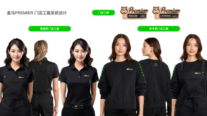 盒马Premier作为盒马鲜生的升级版,需要有自己独特的视觉语言,工服作为vi应用中最能传达品牌视觉语言的载体,因此设计了全套工服表达,包括骑手工服与配送车辆等,整体有别于盒马其他业态。