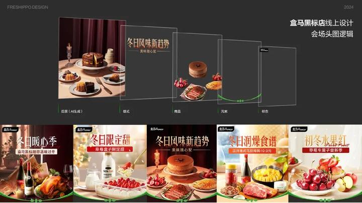 这些色彩的策略运用塑造了盒马Premier的独特色彩识别,满足目标客户的品味,凸显品牌的高端定位。这样的色彩策略令品牌形象更加闪耀,展现其市场独特性和吸引力。