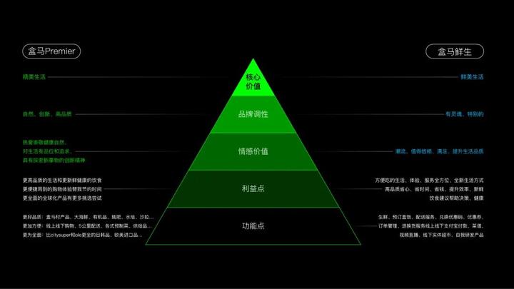 在考虑盒马Premier作为盒马鲜生升级业态的特定角度下,我们还绘制了一个精细的品牌金字塔,确保我们的设计不仅忠实于母品牌的核心价值,同时也强化了盒马Premier独特的品牌属性,体现了其服务升级和价值提升的承诺。
