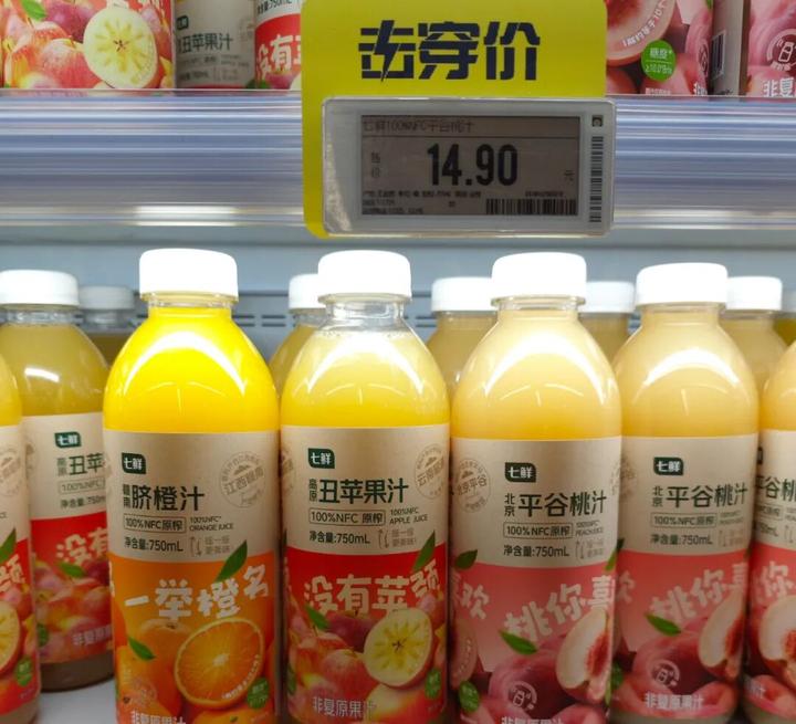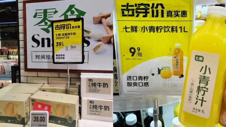 同时值得关注的是,七鲜超市的“击穿价”策略也是其核心优势之一,我们在门店内可以随处可见这一宣传。