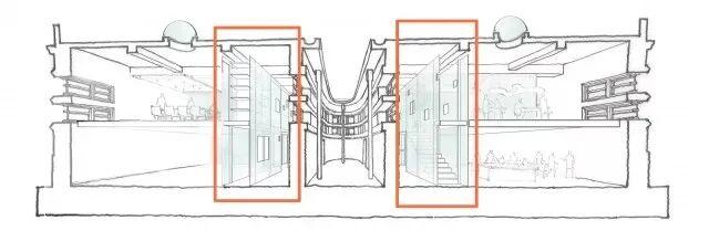 而大厅醒目的木阶梯,则以跳层的方式,采半开放的手法,让部分阶梯内可以收纳书籍,也能坐在其上阅读,同时再利用光源增加层次感,让楼梯如一座光雕艺术品,让人群可以随心定义其用途。