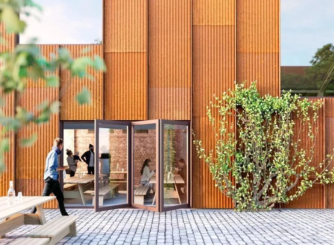 设计师保留了原有建筑的红砖墙,为了延续本来的风格,外立面使用了红色锈面的波形钢片,同时还用同色调材料在旁边进行扩建。