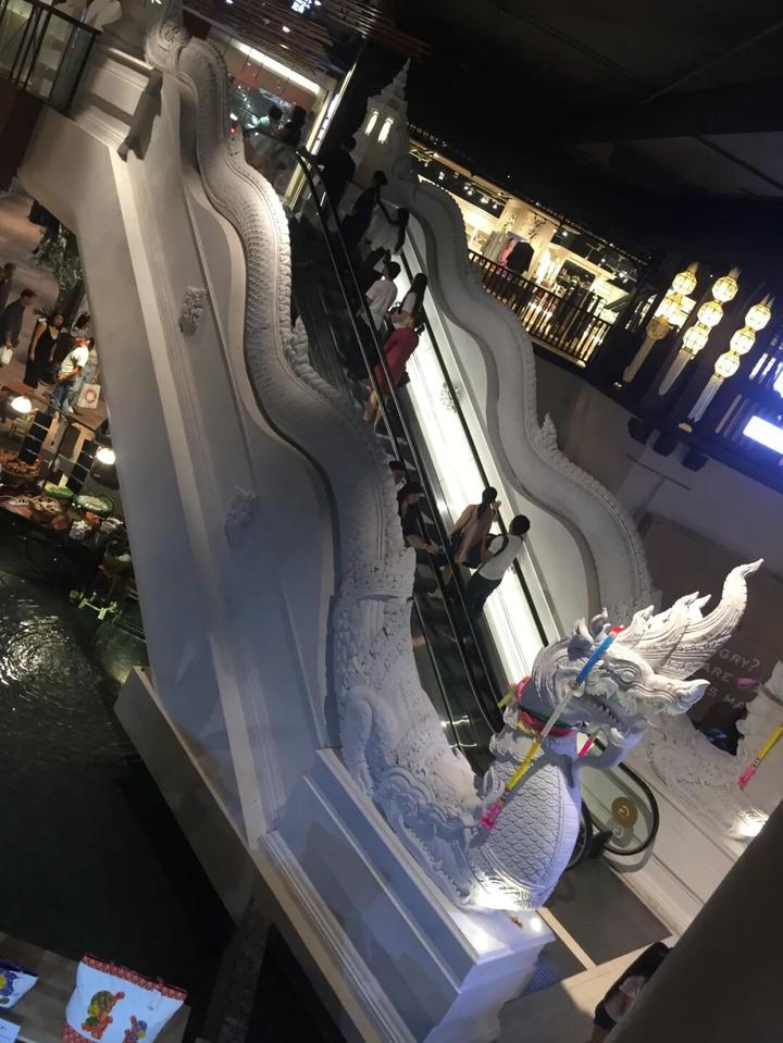 扶梯的扶手外侧为东南亚传统信仰中的娜迦蛇王 (代表水神)
