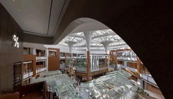 采光顶之下,大小不一的体块互相堆叠、错落有致,在绿植之间虚实掩映,营造出了轻松自然的街区式商业氛围。大阶梯轴心则又自然形成“山脉”形态。