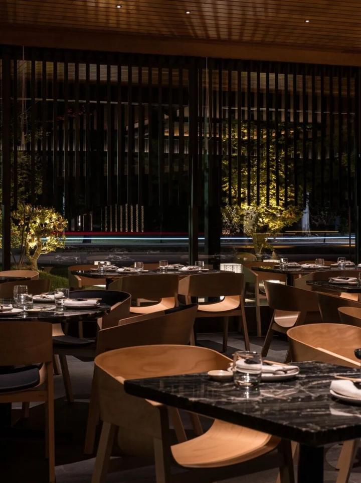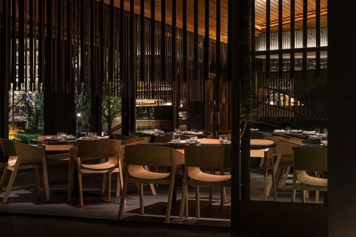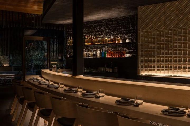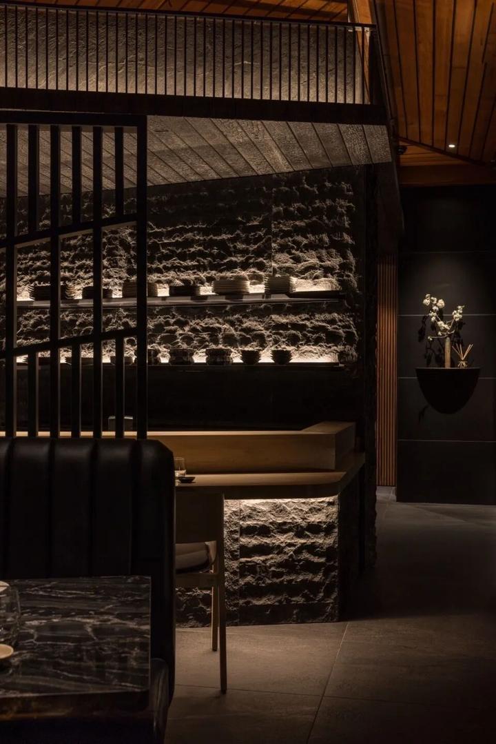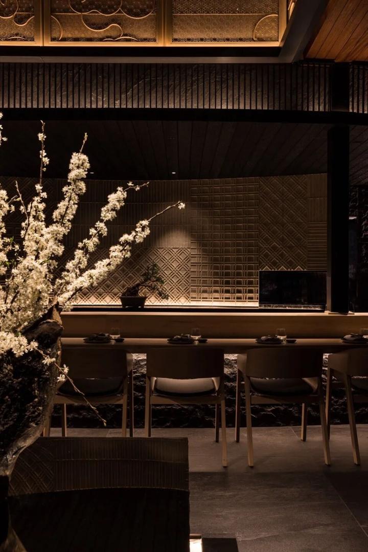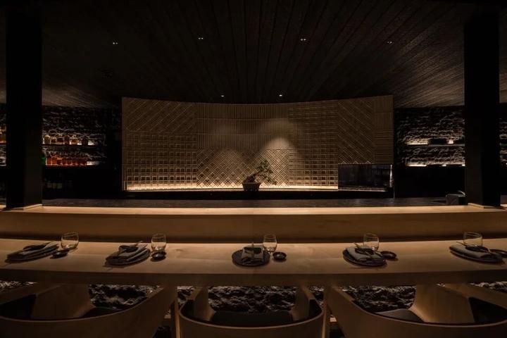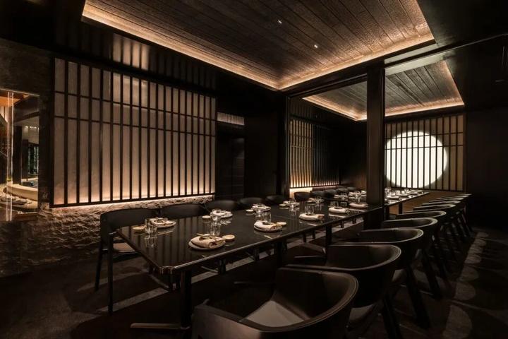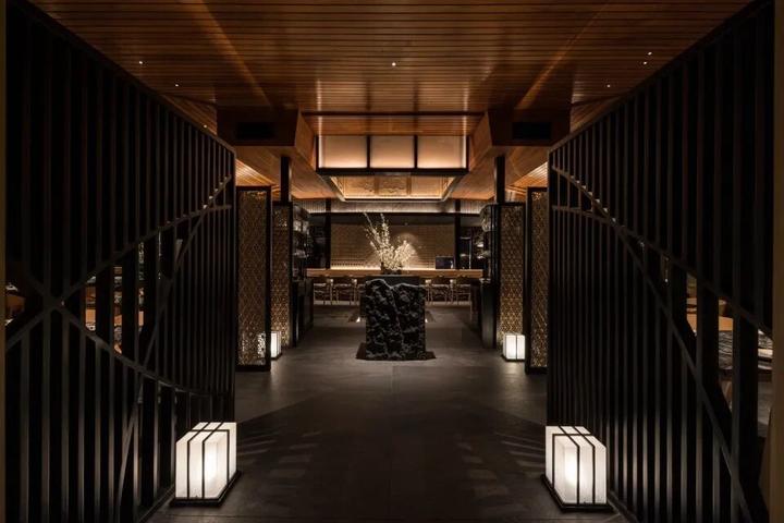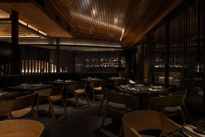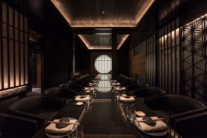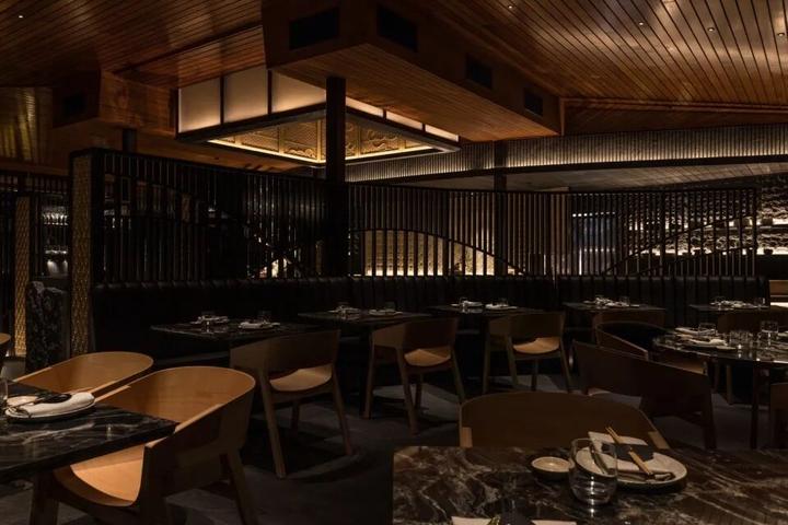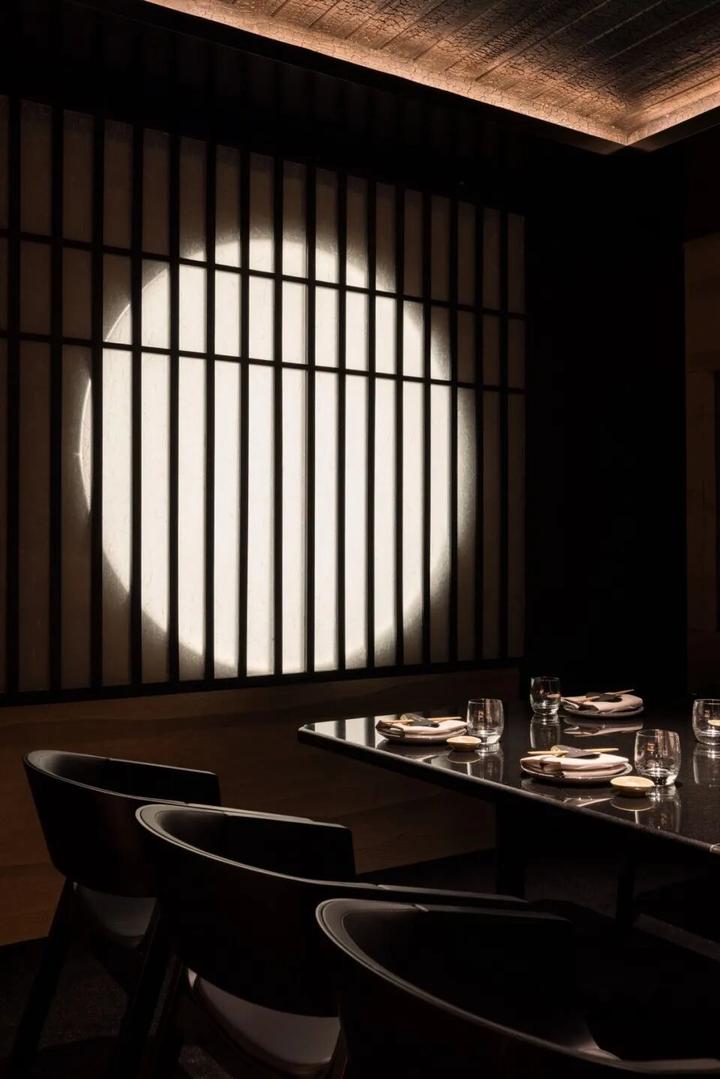 半遮半掩式的构造既保护了顾客的隐私又确保了空间的开放感,弧形格栅和寿司吧台缓解了奢华餐厅自带的紧张感,并且给予空间了节奏韵律和鲜活生气。
