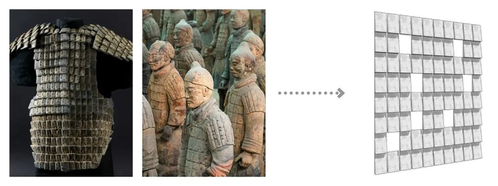 值得一提的是,项目在展现个性化的同时也通过外立面的特殊设计链接、展示城市的历史文化魅力。4-6层主体量立面上使用了阵列布局的混凝土板,其历史感的肌理使人联想到西安秦始皇陵兵马俑的盔甲。