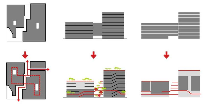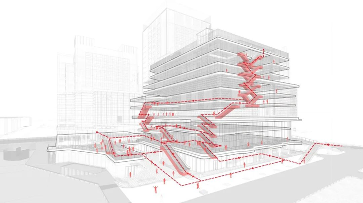 项目通过的概念将建筑分解为五个“层叠城市”,分别是: