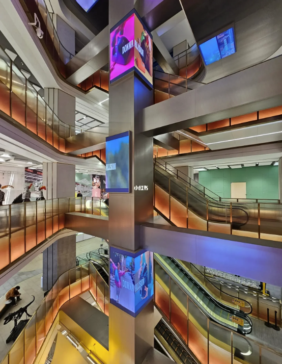 顾客在主中庭沿着富有活力的橙色玻璃蜿蜒向上,在各个主体楼层探索不同的功能与体验。其室内空间的设计为消费者带来了一段丰富多彩、收放自如的“丝绸之路”之旅。